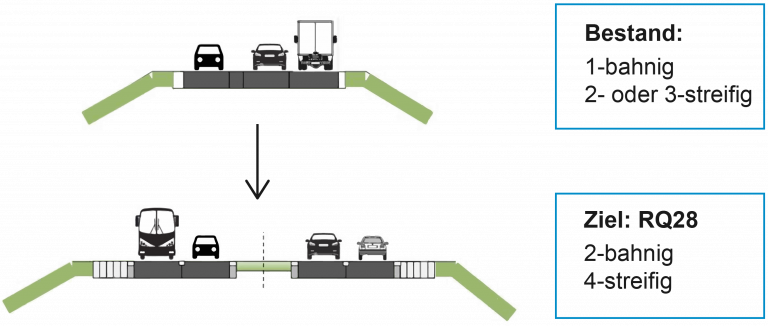 Der vier Meter breite Mittelstreifen beim RQ 28 dient der baulichen Trennung der Richtungsfahrbahnen und der Unterbringung baulicher und verkehrstechnischer Einrichtungen. Die erforderlichen Fahrzeug-Rückhaltesysteme im Mittelstreifen sind zur Vermeidung von Durchbrüchen und damit verbundenen Gefährdungen Dritter auf der Gegenfahrbahn notwendig. Dazu sind zwei einseitig, getrennt voneinander wirkende Schutzeinrichtungen vorzusehen. Die Schutzeinrichtungen stehen jeweils in einem Abstand von mindestens 0,5 m vom inneren Fahrbahnrand und haben eine Breite von rund einem halben Meter, so dass zwischen den Schutzeinrichtungen noch ein Streifen von knapp zwei Metern verbleibt. Dieser Streifen bietet Raum, um bei einem Anprall die dynamischen Durchbiegungen bzw. Verformungen der Schutzeinrichtungen (Wirkungsbereich) aufzunehmen.