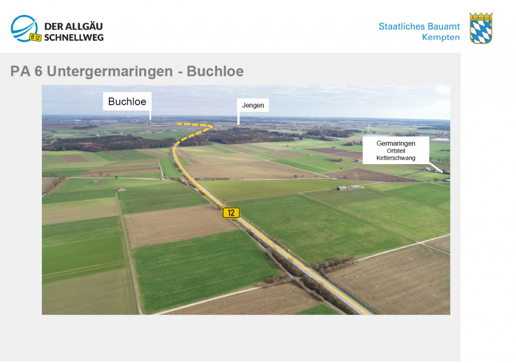Die Planfeststellungsunterlagen zum Ausbau der B12 für den Planungsabschnitt 6 Untergermaringen – Buchloe wurden bereits in den Kommunen ausgelegt. In einer ausführlichen Untersuchung verschiedener Varianten bezüglich der Anbauseite der neuen Fahrbahn im Vorfeld, stellte sich die Variante 1 als die Vorzugslösung heraus. Bei dieser wird die zweite Fahrbahn im südlichen Teil des Streckenabschnitts auf Höhe Untergermaringen bis inklusive Anschlussstelle Jengen (in Fahrtrichtung nach Norden) auf der Westseite erfolgen. Von der Anschlussstelle Jengen bis etwas nördlich der bestehenden Brücke über die Gennach erfolgt auf einer Länge von rd. 600 m ein Wechsel der Anbauseite. Im nördlichen Streckenabschnitt – etwas nördlich des Weilers Schöttenau – bis zur Anschlussstelle an die A96 soll der Anbau auf der Ostseite der bestehenden B 12 erfolgen.